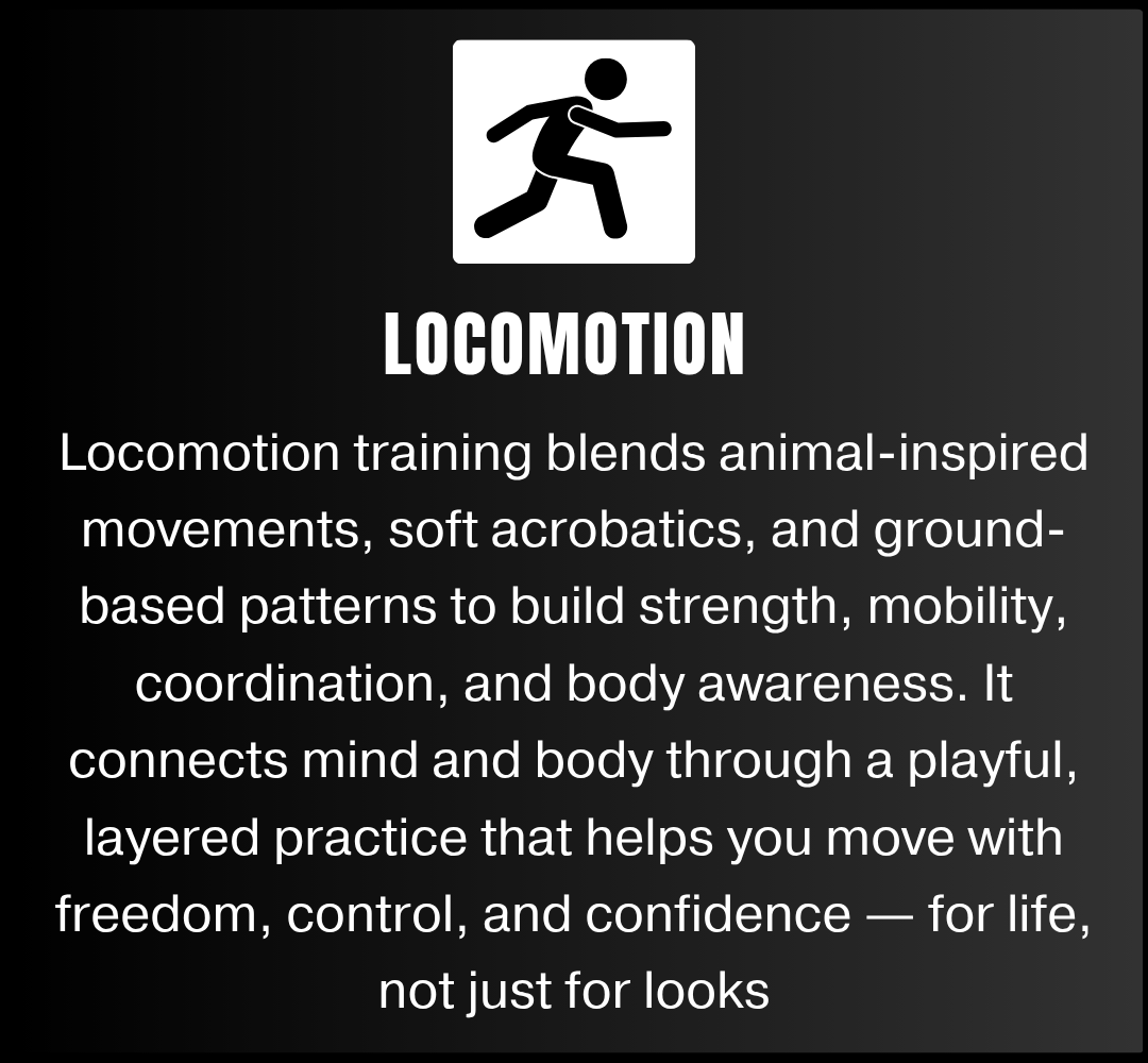 Loco Movement is a unique training system that blends animal locomotion, soft acrobatics, bodyweight strength, and mobility to help you move better, build real-world strength, and reconnect with your body.
